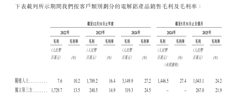 更令人费解的是,创新实业与关联方的交易还呈现出“低价高毛利”的反常特征,这在标准化程度较高的电解铝行业实属罕见。2023年至2025年1-5月,其向关联方销售电解铝的均价分别为16147.2元/吨、17052.4元/吨、17675.0元/吨,分别低于同期向独立第三方的销售均价16355.7元/吨、17733.3元/吨、17777.8元/吨,各年度的关联销售均价均处于相对低位,其中2024年的价差更是达到680.9元/吨。