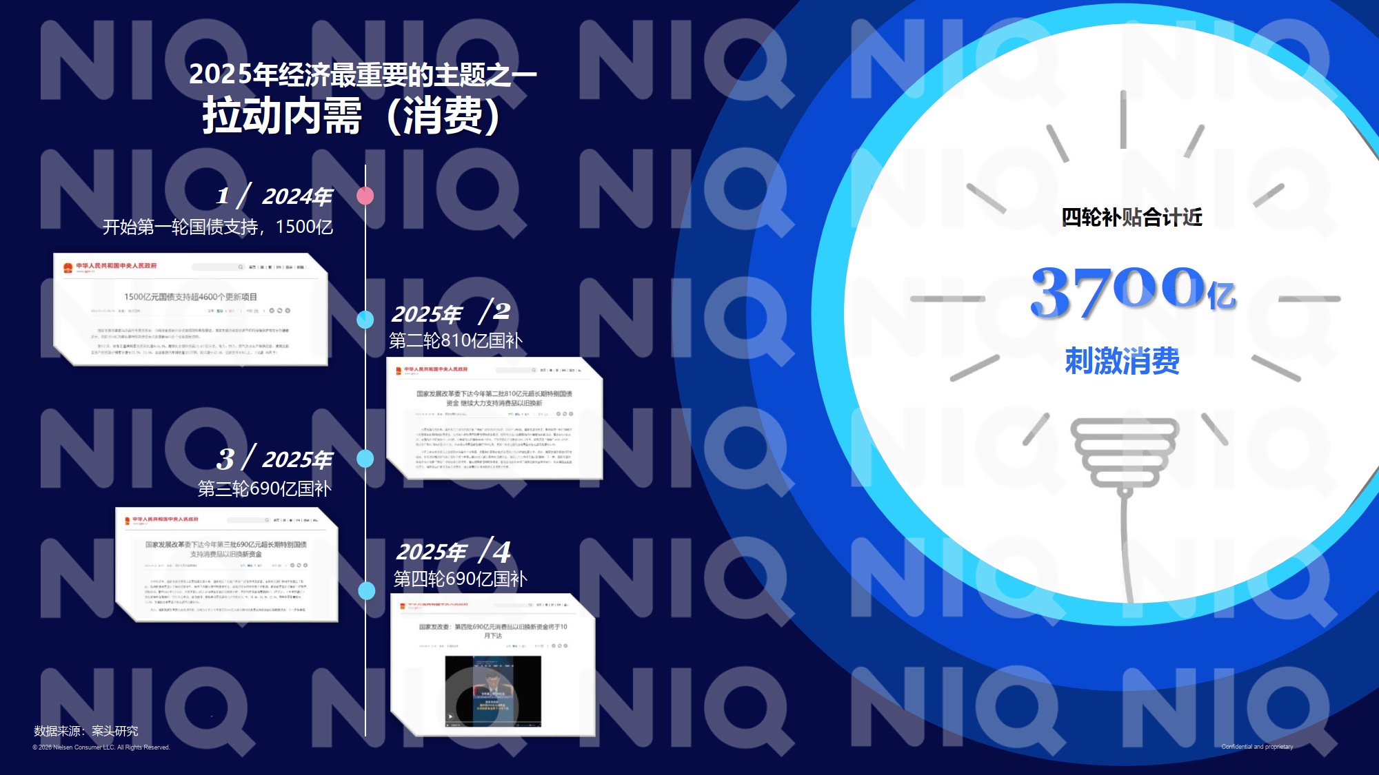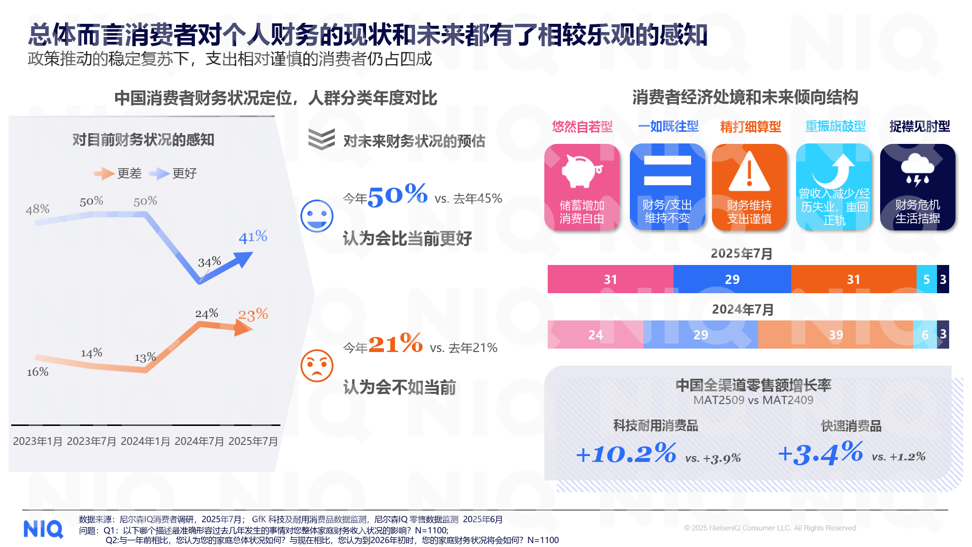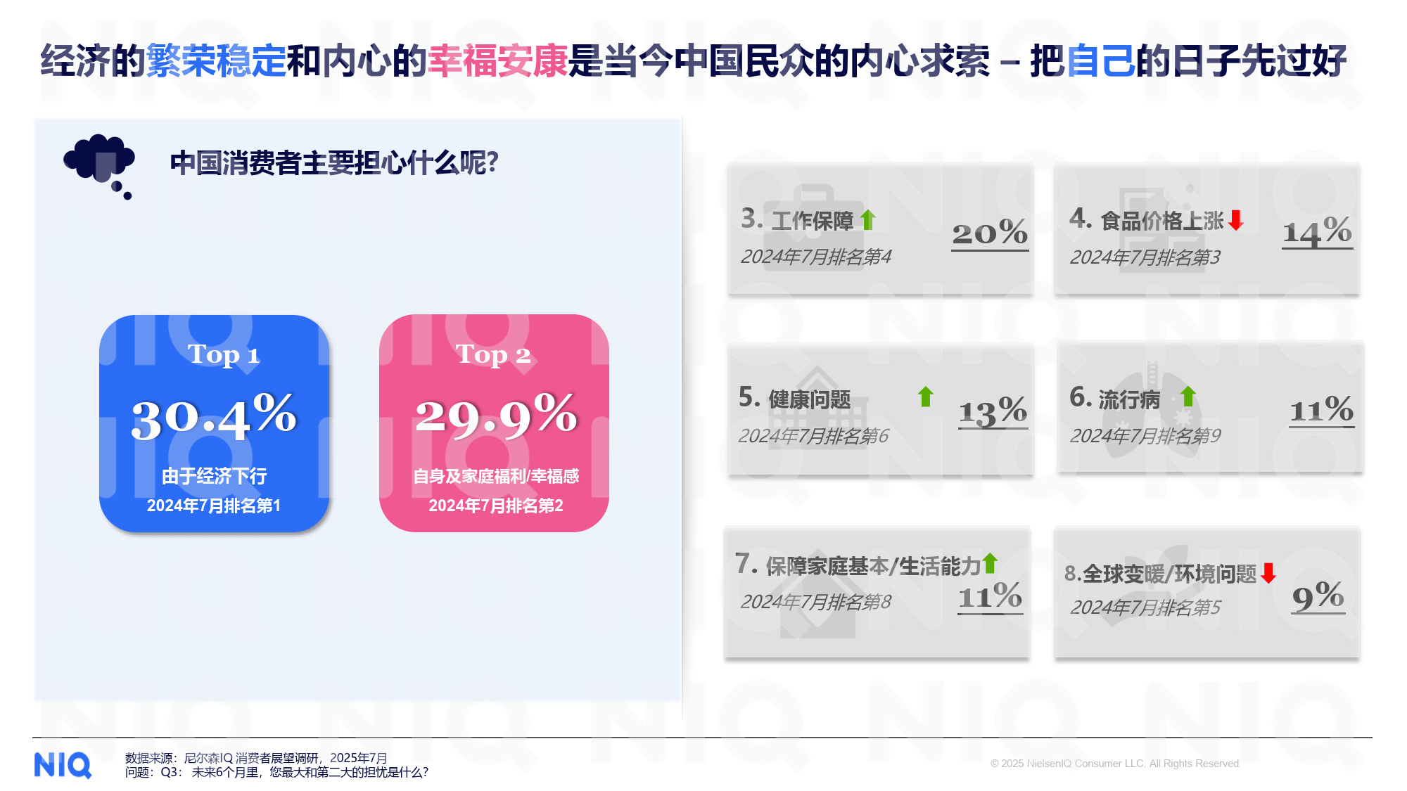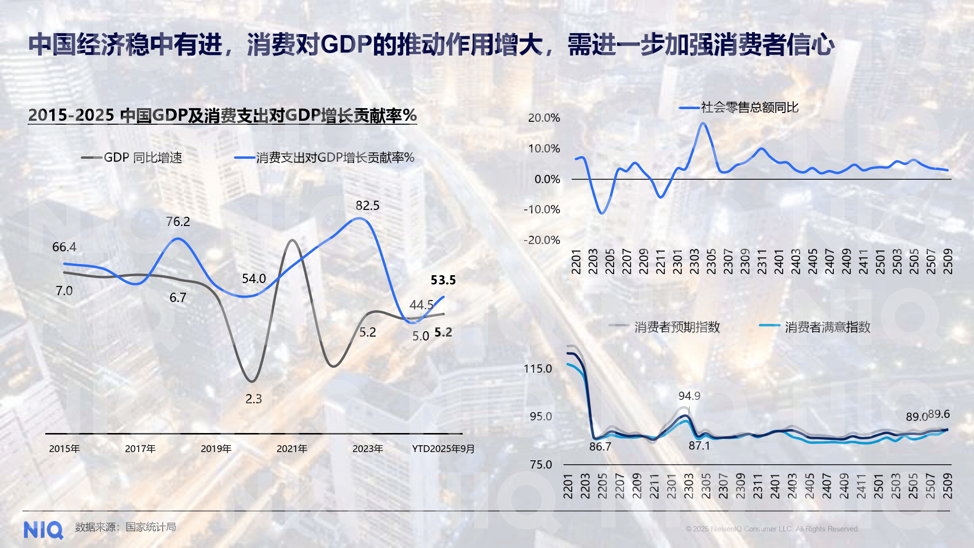 经济层面,中国经济稳中有进,消费对 GDP 增长贡献率持续凸显,2024-2025 年政府通过多轮国债支持与补贴合计近 4600 亿元刺激消费。尽管消费者对财务状况感知整体乐观,但支出谨慎者仍占四成。当前消费者首要担忧集中在经济下行(30.4%)、自身及家庭福利 / 幸福感(29.9%),工作保障、食品价格上涨等亦位居前列。