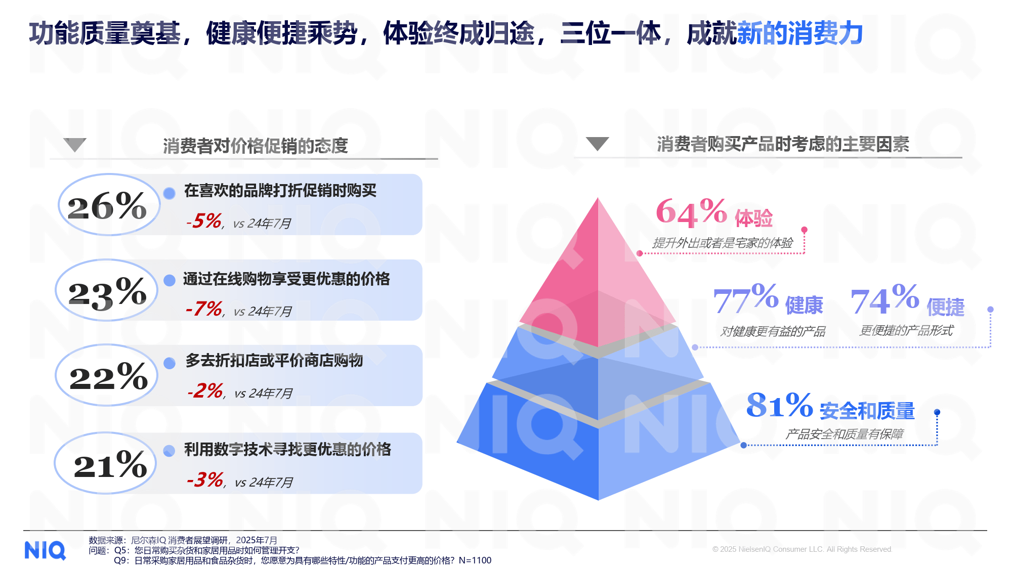 消费核心趋势呈现 “功能质量奠基、健康便捷乘势、体验终成归途” 的三位一体特征。81% 的消费者将产品安全和质量列为首要考量,77% 重视健康属性,64% 关注消费体验,23% 青睐便捷的产品形式。价格敏感度有所下降,各类折扣消费行为占比同比均有回落,消费者更愿意为健康、品质、体验支付溢价。