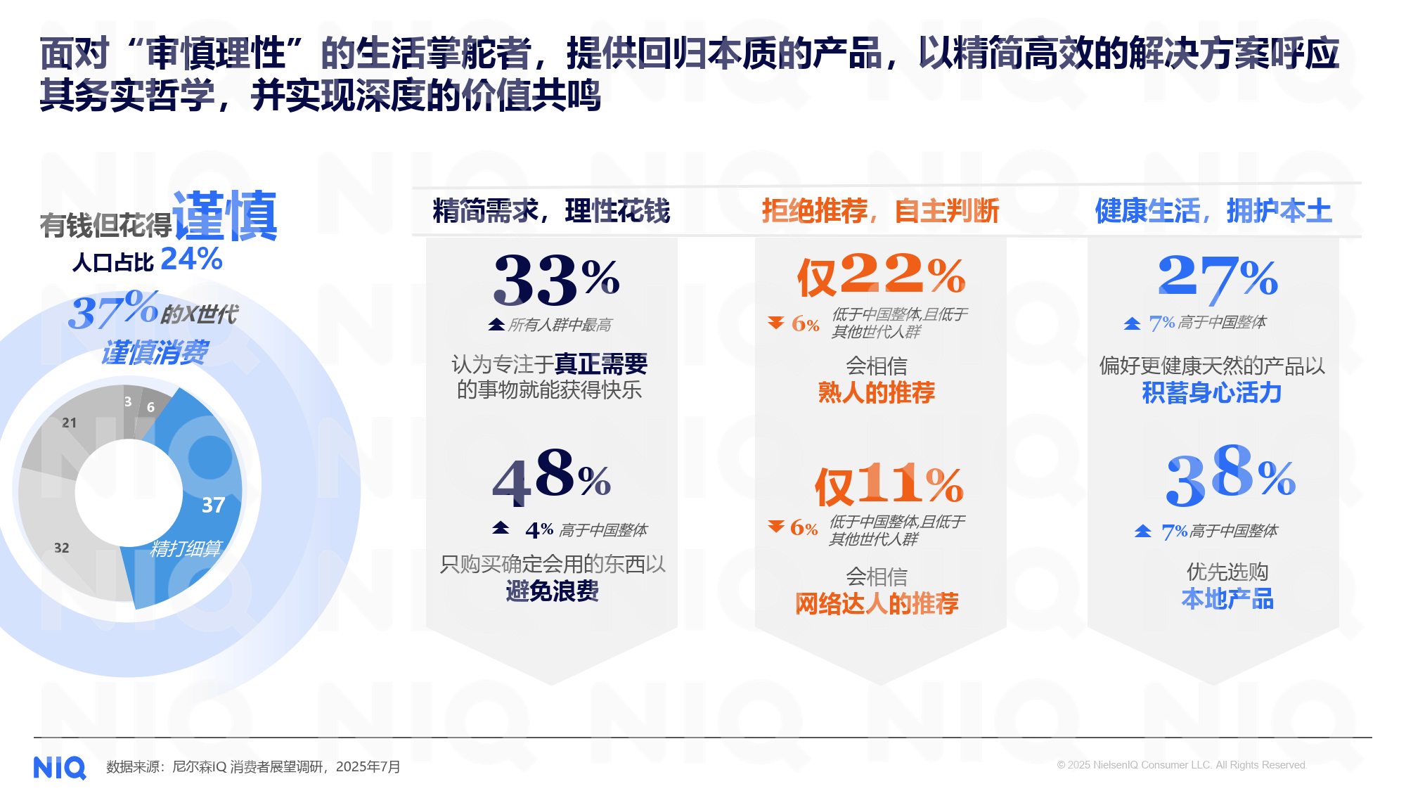 代际消费差异显著,构成多元市场图景。婴儿潮一代(61+,占比 19%)迈向享受型养老,70% 乐于消费,在营养素添加、高端成分产品上消费意愿高于整体,且偏好熟悉品牌与自有品牌,老年护肤、智能穿戴设备等细分市场增速迅猛。X 世代(45-59 岁,占比 24%)务实理性,花钱谨慎,注重精简需求与本土认同,优先选择健康天然、确定实用的本地产品,对推荐信息信任度低。千禧一代(29-44 岁,占比 22%)乐于消费,愿为优质体验、卓越品质、品牌信任及可持续性支付溢价,对即时配送等数字消费体验要求较高。Z 世代(18-28 岁,占比 17%)为圈层认同消费,热衷尝新,在乙女游戏、细分美妆等圈层市场付费意愿强烈,重视省时省力与情绪价值。