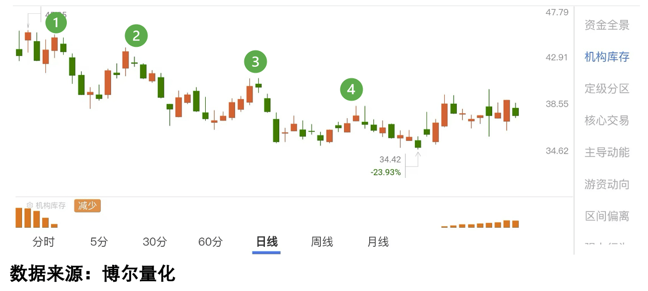 同样的四个反弹位置①、②、③、④,「机构库存」数据始终缺席。这种没有机构参与的反弹,最终难免重归跌途。这两组案例的对比生动说明:股价涨跌只是表象,机构行为才是本质。