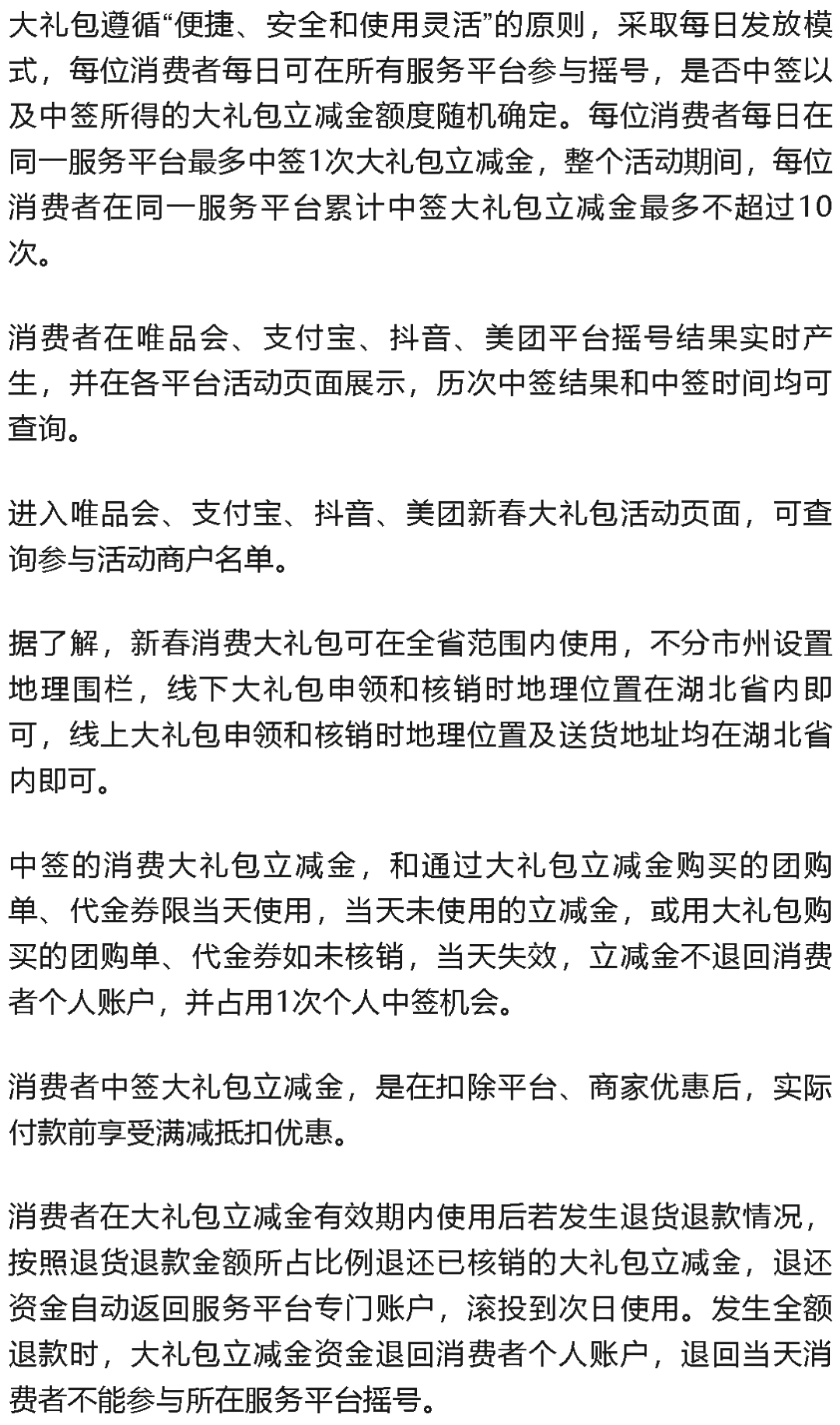 俗话说,过了腊八就是年。 1月26日起,湖北将面向所有在鄂、来鄂消费者发放“乐购湖北 ‘马’上有礼”新春消费大礼包,总额达到1亿元,活动持续到3月31日。