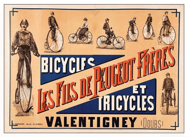 1882年,在阿尔芒·标致(Armand Peugeot)主导下,将实用技术创新哲学成功注入自行车领域。1886年,“标致高轮自行车”开始大规模生产,如图4所示,技术上通过链条驱动取代了直接驱动,骑行更加稳定和安全。1892年创新引入了充气轮胎、球轴承系统,以及三角几何支撑的车架结构,极大的提高了自行车的普及率。与当时流行的英国自行车追求机械效率不同,标致自行车将功能构件进行艺术化编排,车架线条简洁,结构比例优雅,如同凡尔赛园林的几何形态被赋予动感。到1905年,标致已成为法国最大的自行车制造商之一,每年生产超过20,000辆。与此同时,通过竞技赛事的锤炼与成功的品牌营销,标致自行车从工业产品升华为“自由前行的法国”精神象征,为其进军汽车领域奠定了坚实的品牌基石——理性、优雅、值得信赖。