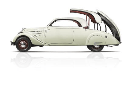 第一辆硬顶敞篷车402 eclipse,车身比例依然体现出对称与均衡的法式偏好,侧面反映了三十年代法国在现代化浪潮中寻求“国家气质”的文化心理。