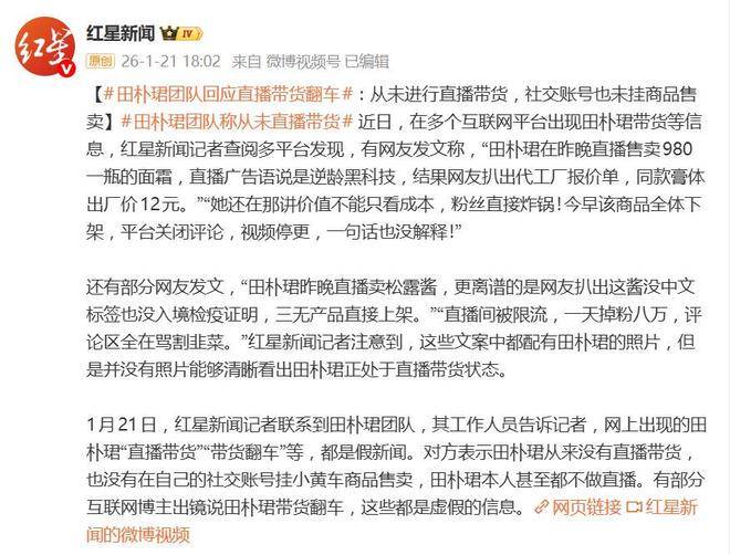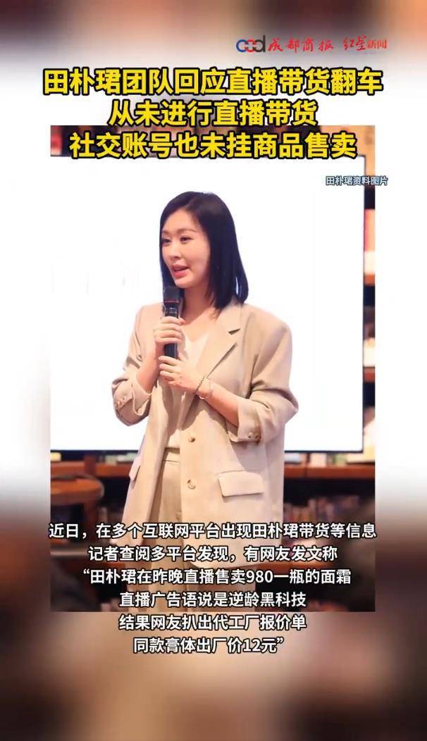 1月22日的报道引发了社交媒体上的一场大波浪,一则名为田朴珺直播带货翻车的消息迅速蔓延开来,吸引了大量吃瓜群众的关注。消息内容刺激而充满戏剧性:980元一瓶的逆龄黑科技面霜,被揭露出厂价仅为12元,售卖无中文标签、无检疫证明的‘三无’松露酱,加上直播间被限流、一天掉粉八万、评论区沦陷等一系列细节,完全展现了一个顶级主播人设崩塌的翻车现场。每一条爆料都有田朴珺的照片相配,但仔细一看,照片中并没有确凿的证据表明她正亲自进行直播带货。画面模糊不清,场景不明,所有的劲爆细节似乎都有些扑朔迷离,给人一种注水过重的感觉。 面对这场舆论风暴,田朴珺的团队终于站了出来,给出了明确的回应。1月21日,团队通过权威媒体发布声明,毫不含糊地否认了所有关于她直播带货的传闻。声明的核心意思只有一句话:这些完全是假新闻!