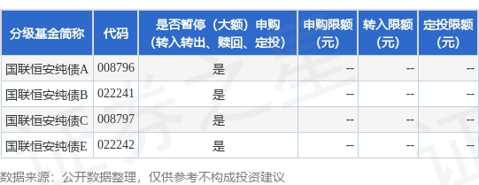 证券之星消息,1月23日国联基金管理有限公司发布《国联基金管理有限公司关于国联恒安纯债债券型证券投资基金暂停向个人投资者申购、转换转入及定期定额投资业务的公告》。公告中提示,为保护基金份额持有人利益,保持基金的平稳运行,自2026年1月23日起国联基金管理有限公司关于国联恒安纯债债券型证券投资基金暂停向个人投资者申购、转换转入及定期定额投资业务,下属分级基金调整明细如下: