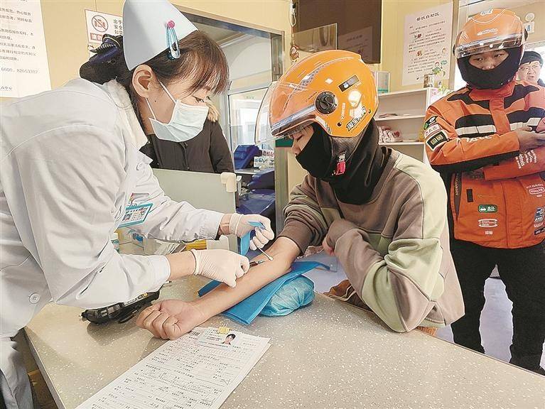 外卖骑手在献血(大连新闻传媒集团记者 孟颖 摄)