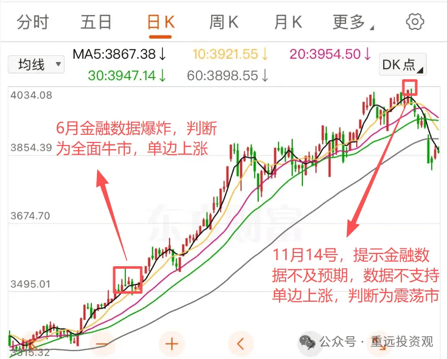然后是11月13日晚发布的金融数据不及预期,我们在14号知识星球做出提示后,股市见顶并开始向下震荡。