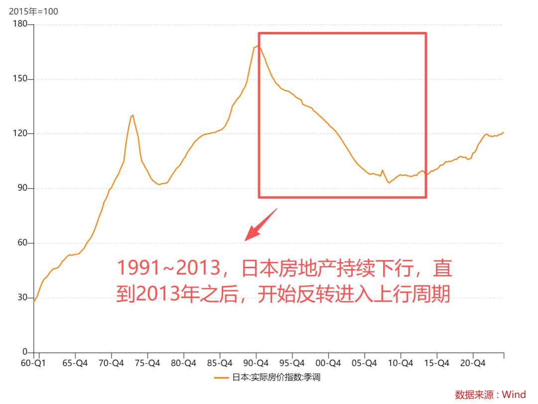 直到2013年之后,股市进入慢牛,楼市则开始触底反转(日本股市楼市数据均取自万得)。