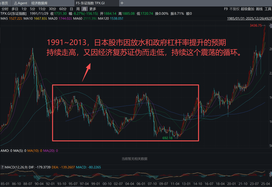 在日本政府持续拉升杠杆率的同期,股市因放水预期而上涨,并因复苏证伪而下行,一直在上上下下的波动(如下红框部分是1991~2013的日本股市),而东京楼市则是一路下行。这正说明股市上涨取决于预期,而楼市需要居民收入真实复苏。
