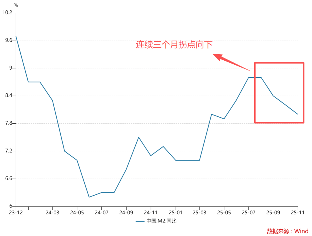 如下,实际上从9月开始,M2增速已经连续三个月下行,在12月的会议结束之前,资本市场担心这可能是趋势,因此造成了股市波动,但会议给出货币宽松和财政刺激的定心丸后,我们知道这并不代表趋势会持续向下。股市就又有了支撑。