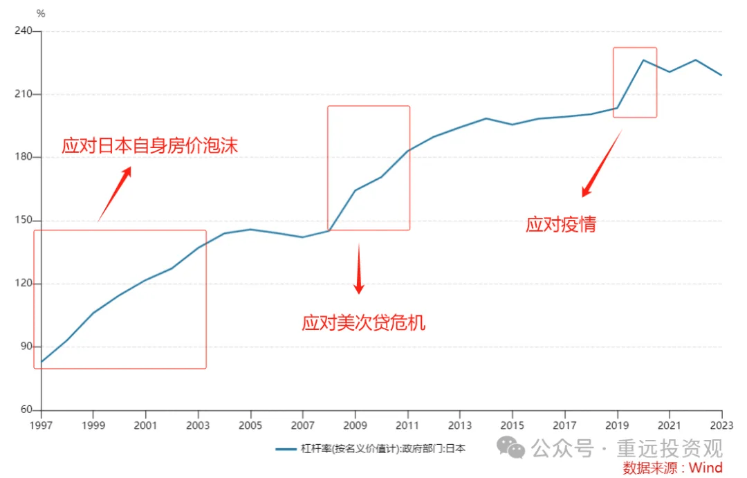 我们看日本在失去30年的整个周期,也是日本政府充当最后的借债人,一路提升政府部门杠杆率放水给社会注入现金,政府部门杠杆率从1997到2013已经翻倍(80%+上升到180%+)。