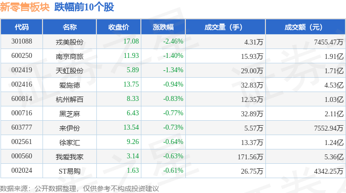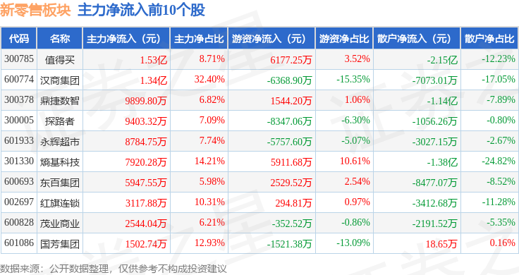 从资金流向上来看,当日新零售板块主力资金净流入3348.55万元,游资资金净流出9716.48万元,散户资金净流入6367.93万元。新零售板块个股资金流向见下表:
