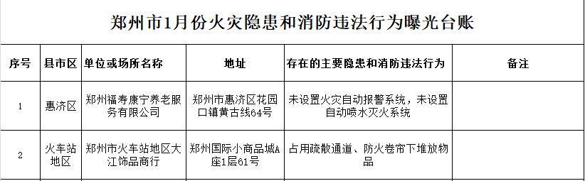1月23日,记者从郑州市消防救援支队获悉,该支队公布了1月份火灾隐患和消防违法行为曝光台账,涉及养老机构、商场等场所。其中,郑州福寿康宁养老服务有限公司存在未设置火灾自动报警系统和自动喷水灭火系统的问题,位于郑州国际小商品城内的大江饰品商行则有占用疏散通道、防火卷帘下堆放物品的现象。
