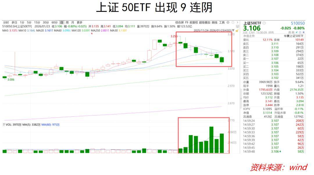 不过需要注意的是,本周上证50ETF、沪深300ETF频频放出巨量,前者更是走出了一波日线“9连阴”,反映出有资金在目前位置阶段性止盈,并且尚未出现止跌信号,投资者短期可能需要回避其背后的权重个股。