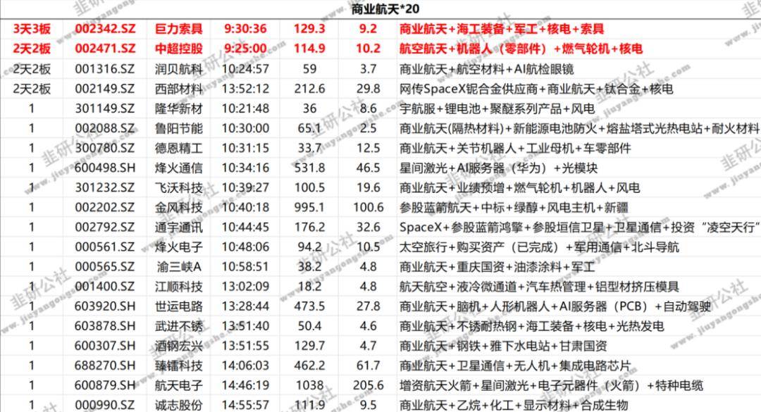 而种种消息的结果,自然是商业航天板块的再度爆发,其中与“太空光伏”概念相关的涨停个股数量多达35只,而其他商业航天概念个股涨停数量也达到20家,足以见得资金介入力度之强,而这也侧面坐实了马斯克最强“带货天王”的名号。