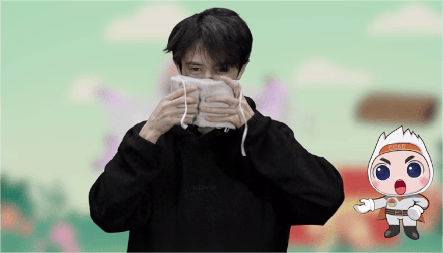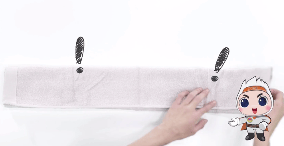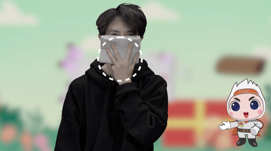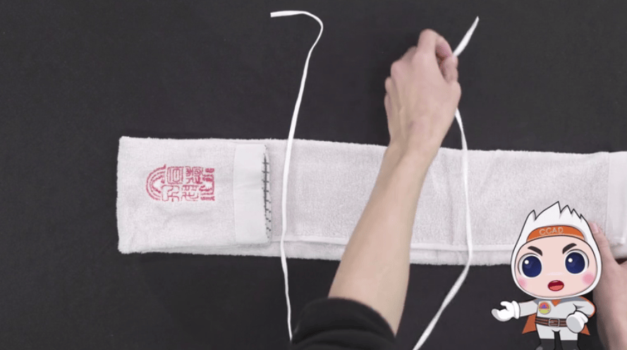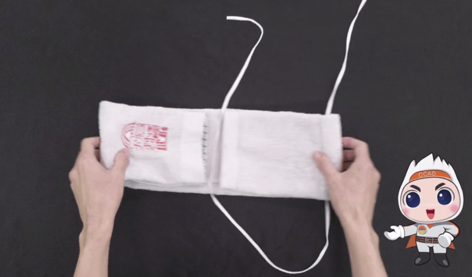 将口罩正面覆在脸上,闭环的绳子放在脖子后,带子系在耳后。使用过程中,注意保持毛巾一直湿润,过滤效果会更好。