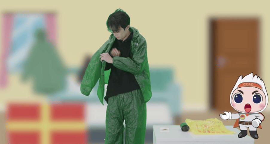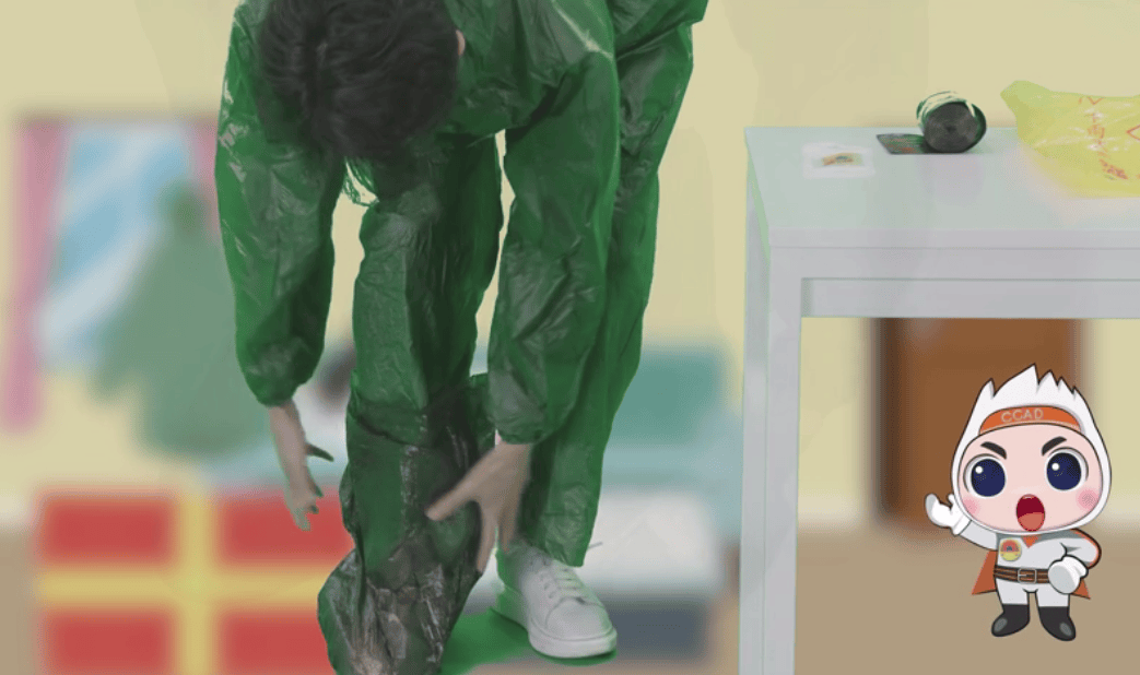 至此,简易防护服制作完成。如有条件可尽量穿戴橡胶手套和简易防护面罩或口罩等,整体防护效果会更好。