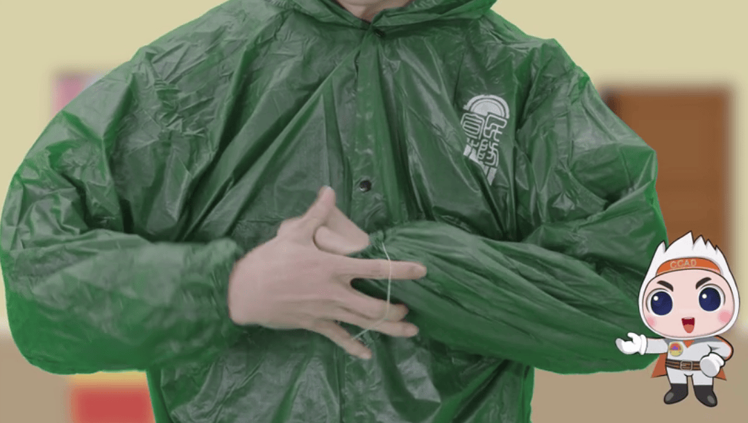 把雨衣、脚套相接处,以及袖口、领口等部位用橡皮筋紧紧扎好,尽量绑牢固。