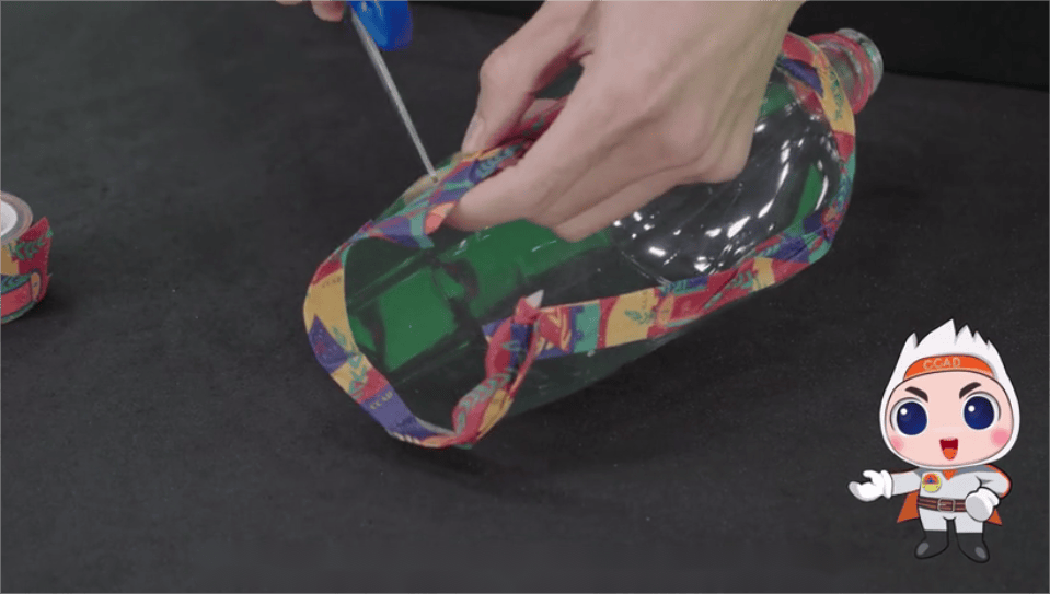 用胶带粘好饮料瓶的毛边,防止割伤。