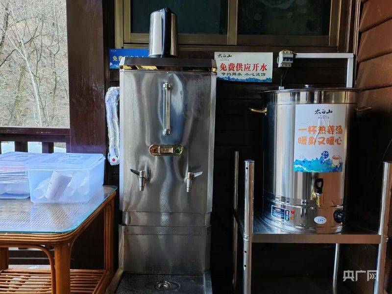 莲花峰瀑布是太白山景区的一大奇景,瀑布如银链般从峭壁间奔腾而下。冬日降温后,这条瀑布变成晶莹剔透的冰瀑布,巍巍壮观。记者注意到,莲花峰瀑布周围路面的积雪未消,工作人员正来回撒着融雪剂,不远处的“爱心驿站”内,热腾腾的姜汤、暖宝宝贴、湿纸巾等免费供应。