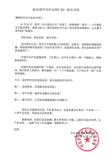 随后,在家的电器《给全国开关行业同仁的一封公开信》中,家的电器提到,公牛集团向其索赔420万元,并称要“坚决应诉,绝不妥协”,并呼吁开关同行“敢于发声”。