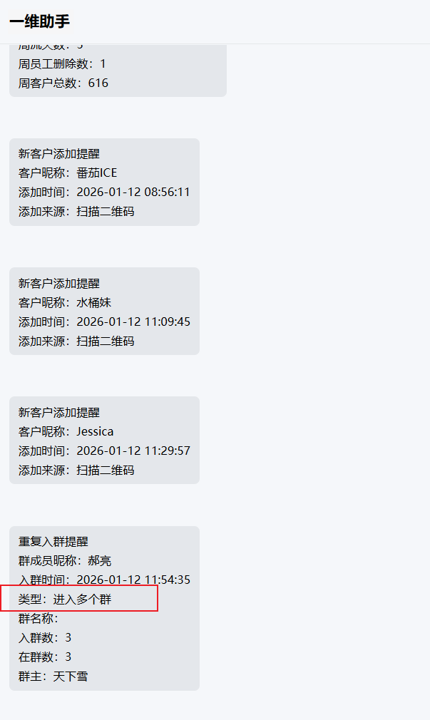 如果发现客户退群,或者入群了,也会及时的发出提醒,便于需要对在群状态有要求的福利,进行及时的清理和跟进。