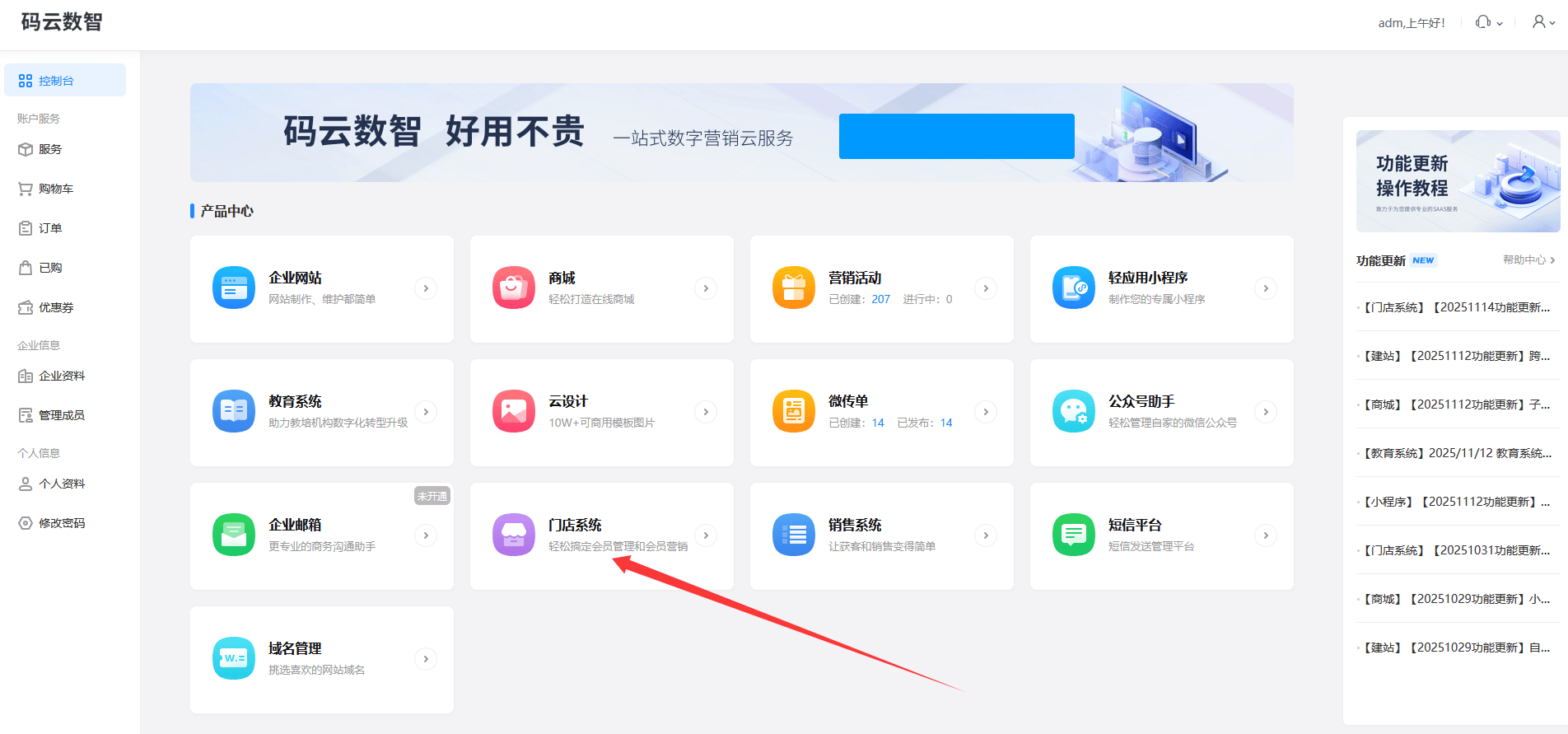 百度搜索【码云数智】,在【码云数智】平台注册账号,产品类型选择--门店系统