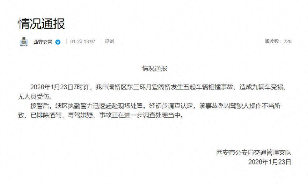2026年1月23日7时许,我市灞桥区东三环月登阁桥发生五起车辆相撞事故,造成九辆车受损,无人员受伤。