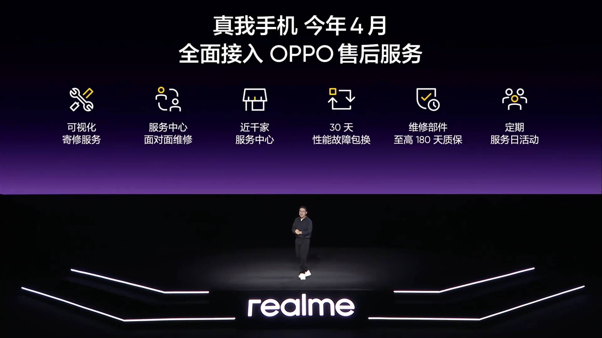 “今天给大家带来一个好消息,realme将正式回归OPPO,从今年4月起,我们将全面接入OPPO的售后体系!”