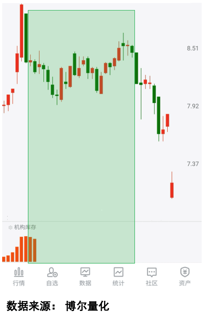 左侧的股票虽然震荡走低,但「机构库存」数据一直活跃,说明机构资金有明确意图;右侧的股票看似震荡走高,可「机构库存」数据早就消失,机构参与意愿极弱,上涨根本无法持续,最后只能一落千丈。