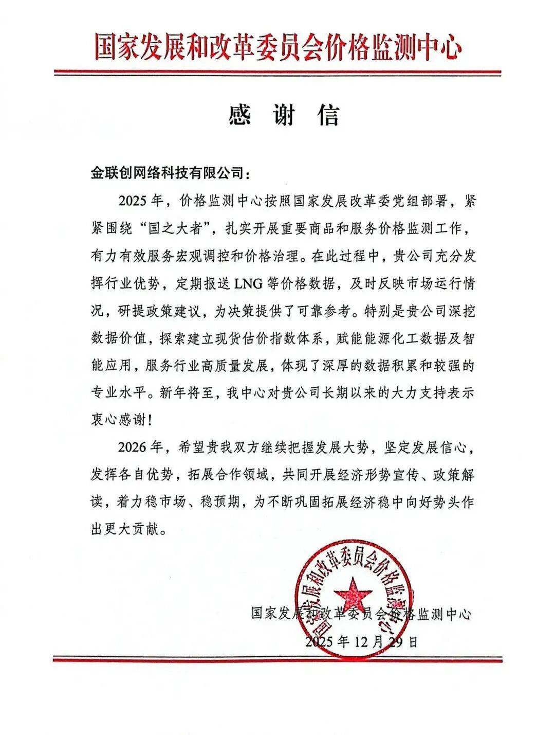 近日,金联创再度收到国家发展和改革委员会价格监测中心发来的感谢信,信中对金联创在2025年积极配合国家价格监测工作、发挥行业数据优势、助力宏观调控与价格治理方面所作的贡献给予高度认可。这已是金联创连续第九年获此殊荣,不仅体现了双方持久而稳固的战略伙伴关系,更彰显了国家权威部门对金联创专业能力与服务价值的长期信赖。