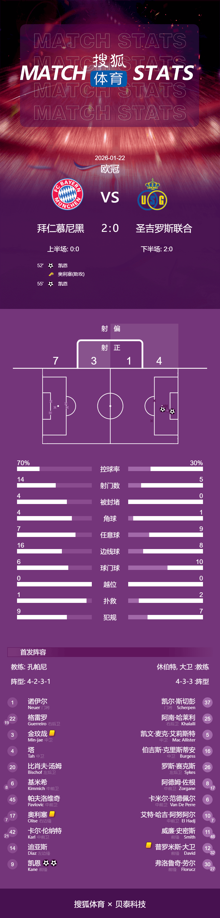 北京时间1月22日凌晨4:00,2025-26赛季欧冠联赛阶段第7轮,拜仁慕尼黑在主场对阵圣吉罗斯。上半场比赛,两队均无建树,半场双方0-0战平;下半场,凯恩三分钟内连入两球,随后金玟哉两黄变一红被罚下场,凯恩点球罚丢错失戴帽良机,最终拜仁2-0战胜圣吉罗斯,七场过后6胜1负积18分提前锁定前八。