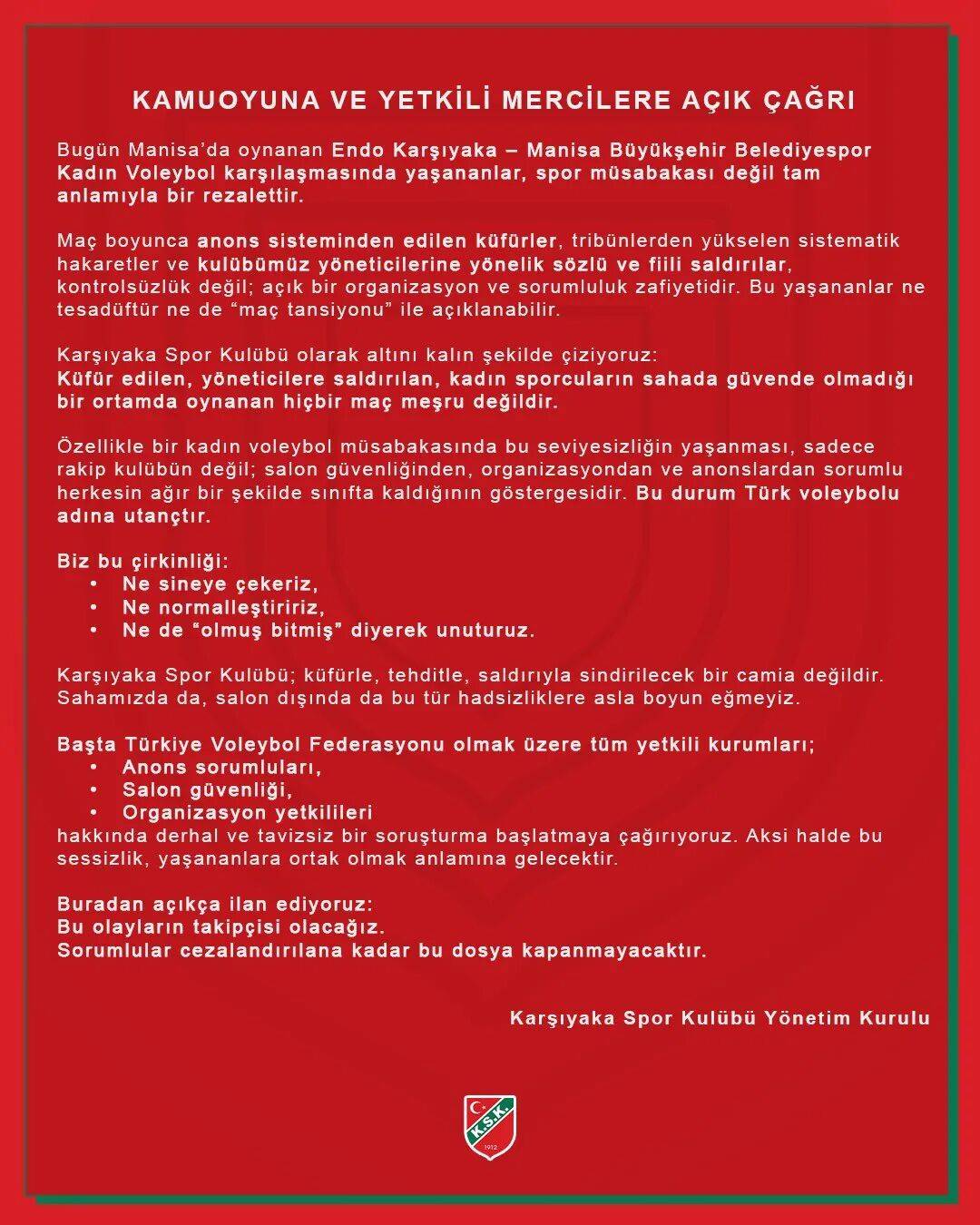 声明中指出,比赛期间从播音系统传出的咒骂客队,对客队的观众席持续的系统性侮辱,甚至包括对俱乐部高层的语言与肢体攻击,已严重超越体育竞赛应有的界限,这不仅是组织方失责,更暴露出土耳其排球某些层面存在的系统性安全漏洞。
