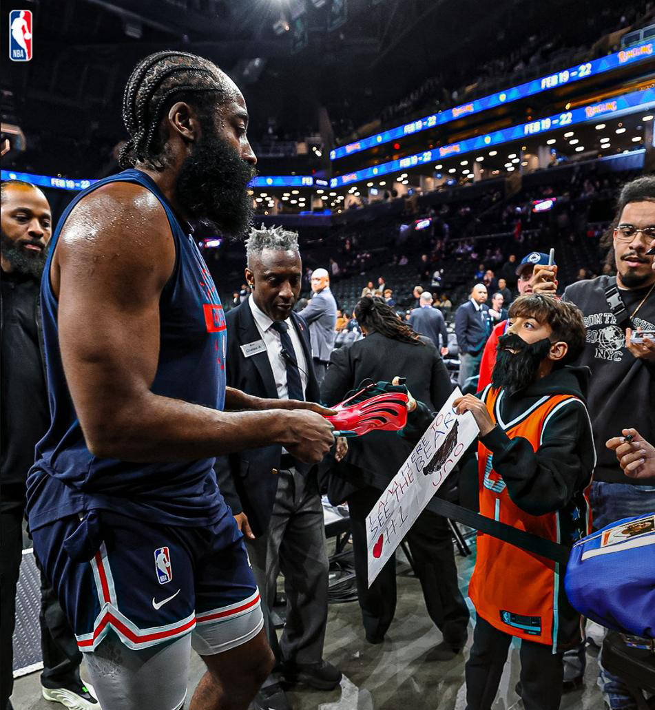 此前,哈登曾在这座城市效力两个赛季,期间带伤坚持为球队效力。他拖着腿筋拉伤的脚步依然拼命扛起球队,赢得了广泛尊敬,因此当篮网选择交易他时,球迷们并无责怪之意。每一次哈登回到这里,都能受到热情的欢迎和鼓励。在这场比赛前,一位小球迷特意举着支持哈登的展板,甚至留着浓密的大胡子来声援偶像,这份真诚打动了哈登,他温情地赠送了签名球鞋,场面感人至深。