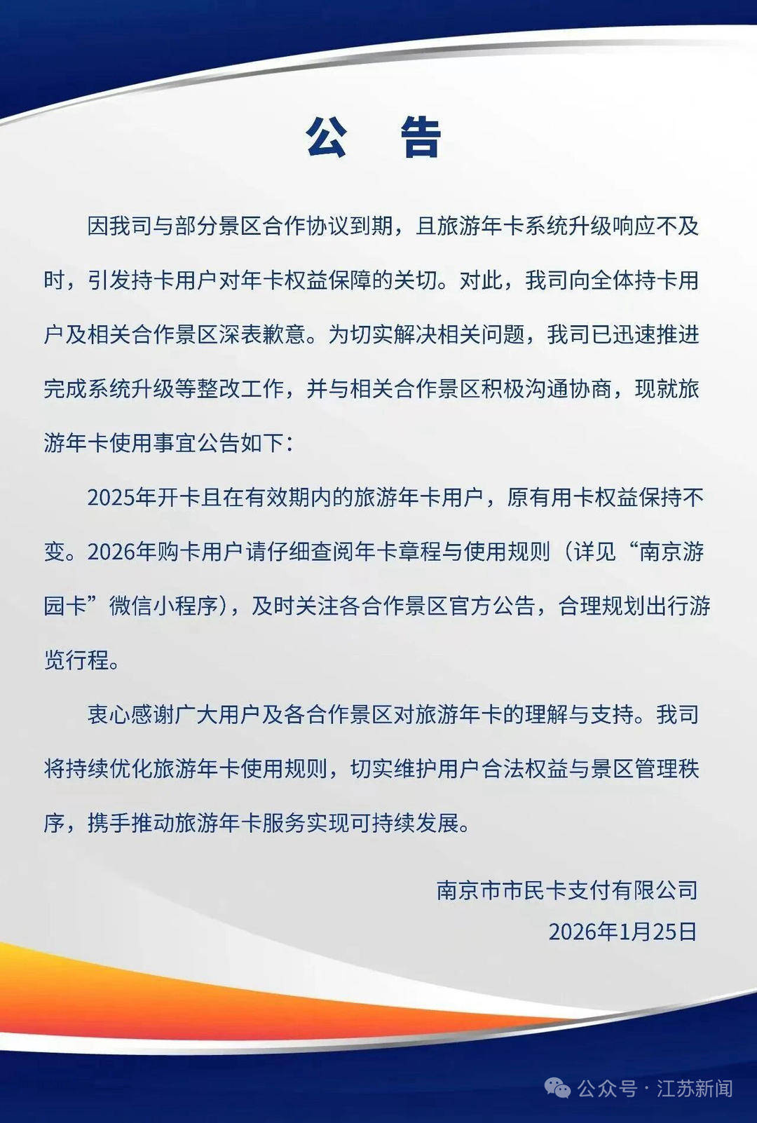 为切实保障用户权益,明确使用规则,南京市市民卡支付有限公司于2026年1月25日正式发布公告。公告除明确2025年开卡且在有效期内用户的权益不受影响外,还特别提醒2026年新购卡用户,需提前仔细查阅旅游年卡的官方章程及具体使用规则,同时及时关注各合作景区发布的官方公告,以便合理规划出行及游览行程,避免因信息差影响游览体验。