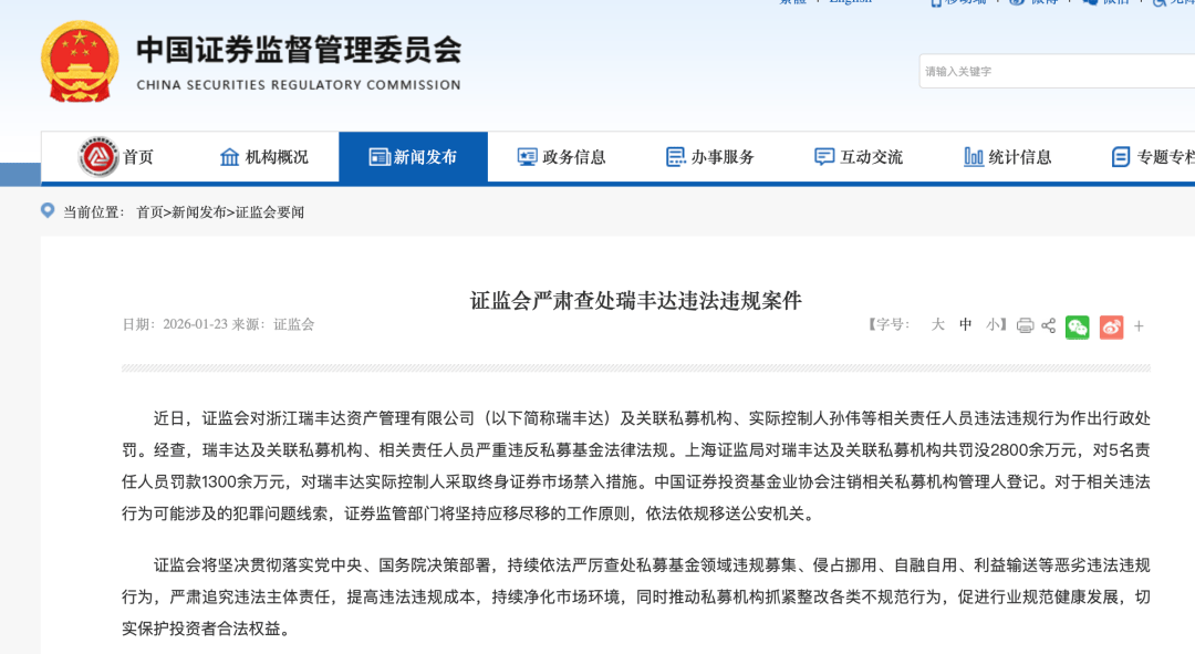 根据中国证监会1月23日发布的消息,中国证监会近日对浙江瑞丰达资产管理有限公司(简称“瑞丰达”)及关联机构、责任人员合计罚款4100万元,处罚力度为私募行业“史上最重”。