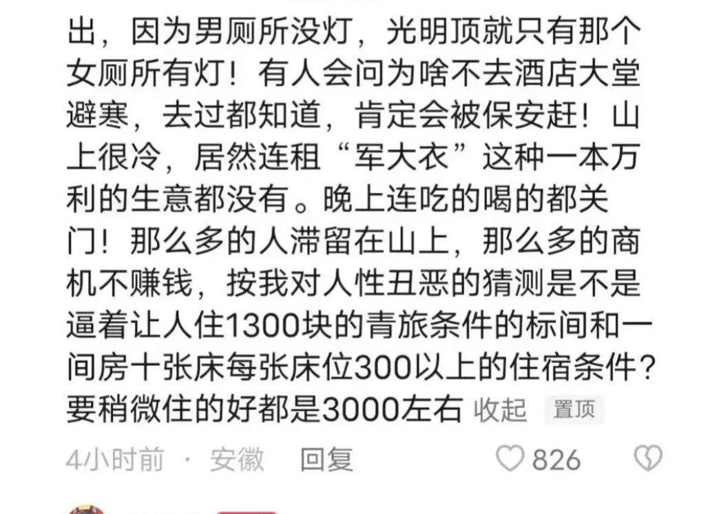 蓝战非指出,黄山的乱收费主要体现在住宿和饮食两方面。虽然黄山并不是最高的山,但其壮丽的景色和艰难的攀登让不少游客选择在山顶住宿。然而,黄山的住宿价格令人咋舌,一家简陋的旅馆一晚就要1300元,而价格更高的酒店则能轻松达到几千元。对于一些经济条件一般的游客来说,如果天黑了又无法下山,他们只能勉强在厕所里避寒。
