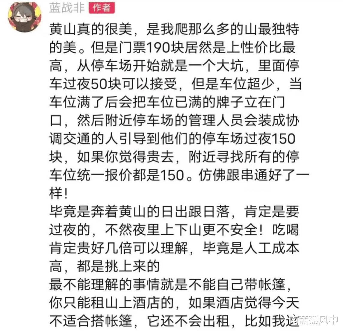另外,黄山的餐饮价格也极为离谱。一道普通的荤菜,餐馆就能收取200元的费用。如果是带着家人来旅游的游客,尤其是有老人和孩子的家庭,恐怕很难忍受这种高额的消费,必须忍受高价餐饮的“摧残”。而停车问题也是游客投诉的重点。黄山景区周围的停车费高得令人瞠目结舌,白天一个停车位就要收近200元,晚上还要额外加收费用。而且,这些停车场的服务也远远不够,当官方停车场停车位已满时,工作人员并未采取措施疏导,甚至有一些私家停车场的工作人员会冒充管理人员,引导游客停到私人的停车场,收取更高的费用。 所有这些问题让蓝战非感到愤怒,也让其他去过黄山的游客纷纷表达了自己的不满。与其他名山相比,黄山的高收费和管理混乱问题,显然已经存在很长时间。游客的不满情绪早已积压,若不及时整改,黄山的形象必将受到影响。 黄山,作为中国的瑰宝,理应得到每一位游客的尊重与保护。高山不易攀登,适当涨价可以理解,但乱收费的行为却严重影响了游客的体验。希望相关部门能够对黄山的乱收费现象进行调查和整治,确保黄山的美丽和文化能够得到应有的保护和尊重。