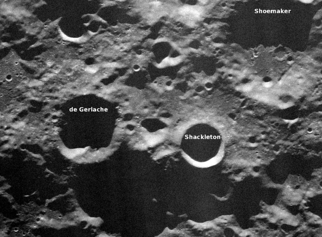 当然,这个月球南极沙克尔顿陨石坑并不是一个小区域,它的中心月面坐标为89.67°S 129.78°E,直径20.92公里,深度约4.2公里。
