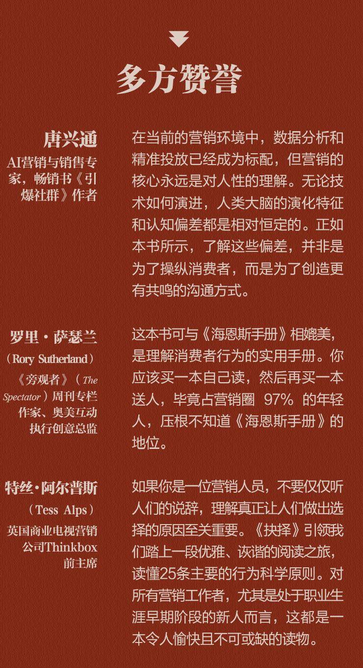 虽然《抉择》表面上是一本面向营销与销售从业者的书,但其内容对普通消费者同样具有启发意义。通过理解自己与他人的决策机制,我们可以更清醒地看待自己的消费冲动,避免落入心理陷阱。正如推荐人、AI营销专家唐兴通所言:“了解这些偏差,并非是为了操纵消费者,而是为了创造更有共鸣的沟通方式。”