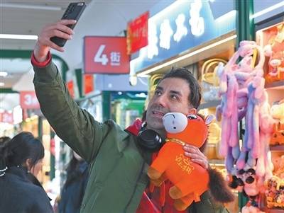 1月12日,在浙江义乌市国际商贸城一区玩具销售区,芬兰外商与“哭哭马”小马公仔玩具合影。 吕 斌摄