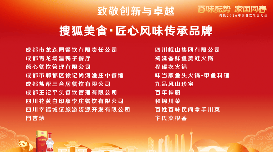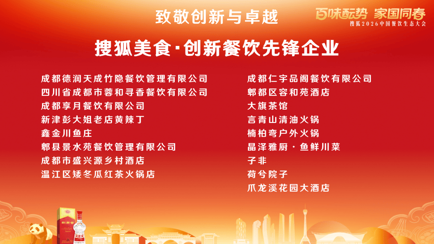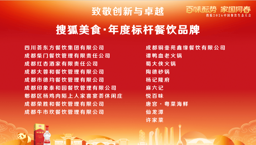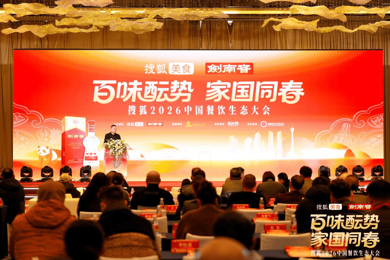 1月25日,以“百味酝势,家国同春”为主题的搜狐2026中国餐饮生态大会在“美食之都”成都圆满举办。本次大会由搜狐美食与中国名酒剑南春联合主办,中国饭店协会指导,创业邦承办,成都餐饮企业联合会协办。活动汇聚餐饮界领袖、品牌创始人、行业专家及媒体代表,共同探讨餐饮行业在文化传承、品牌创新与时代发展中的新路径。大会隆重颁发搜狐美食三大年度奖项——“年度标杆餐饮品牌”“匠心风味传承品牌”“创新餐饮先锋企业”,表彰在相关领域表现卓越的餐饮企业。