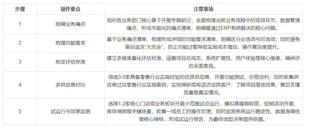 为系统性规避上述选型风险,确保ERP项目顺利落地并发挥实效,建议零售企业遵循“需求导向、科学评估、稳步落地、持续优化”的核心原则,按以下规范步骤有序推进ERP选型工作,确保每一步都精准对接业务需求: