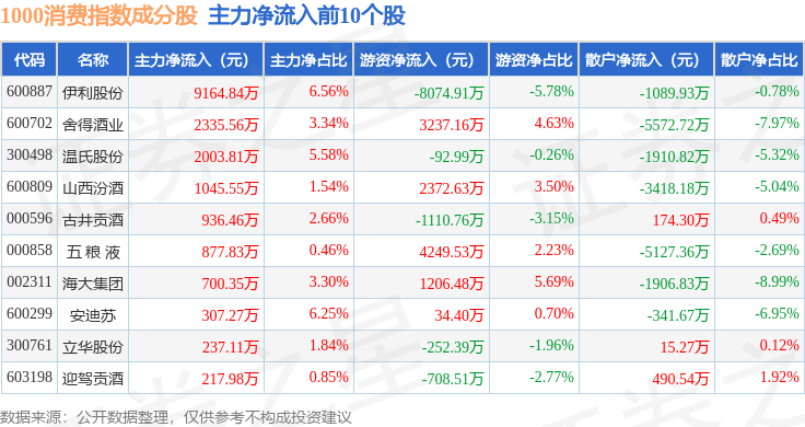资金流向方面,1000消费(399385)指数成份股当日主力资金净流出合计7.62亿元,游资资金净流入合计2.64亿元,散户资金净流入合计4.98亿元。成份股资金流向详情见下表: