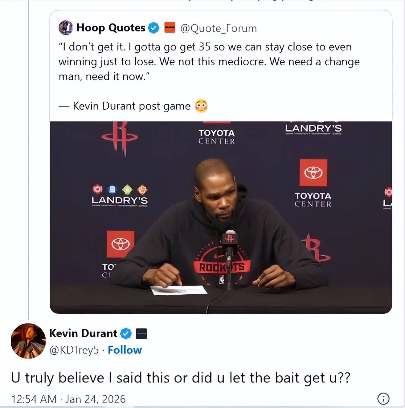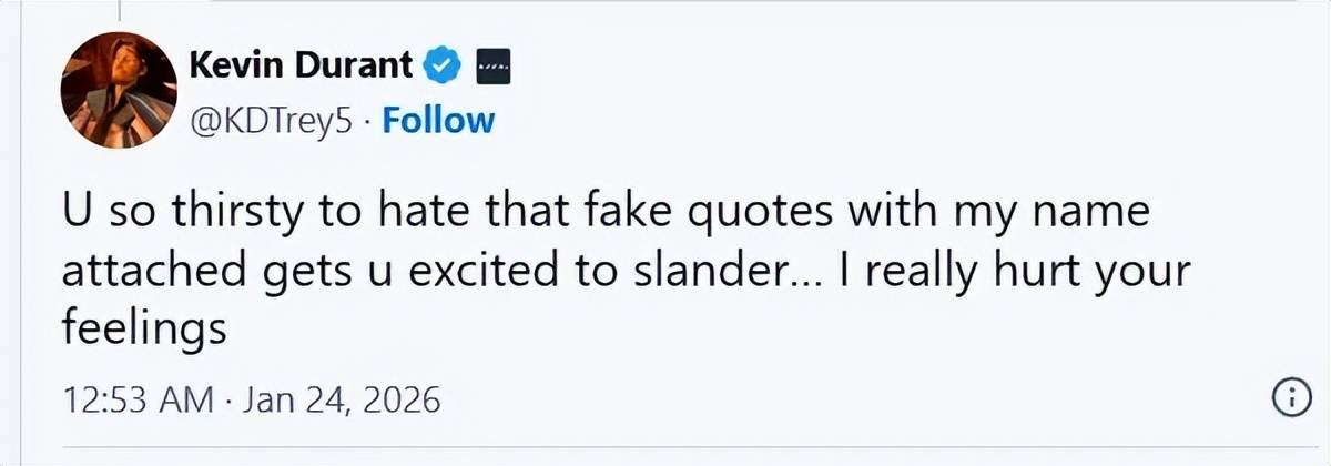 这话一出来,不少人还真信了,但熟悉杜兰特的都知道,这根本不可能是他说的。果不其然,杜兰特本人很快就在社媒上直接回应球迷,语气里满是无奈又带着点犀利:“你是真的相信这话是我说的,还是单纯掉进别人设的圈套?” 不得不说,这个反问真的一针见血,直接点破了那些传播假消息的套路。