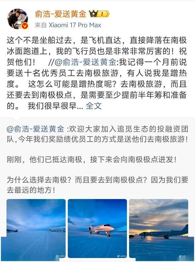 瑞财经 王敏 1月25日,追觅科技创始人俞浩官博发文称,公司已将十名优秀员工送往南极旅游,并计划向南极极点进发。