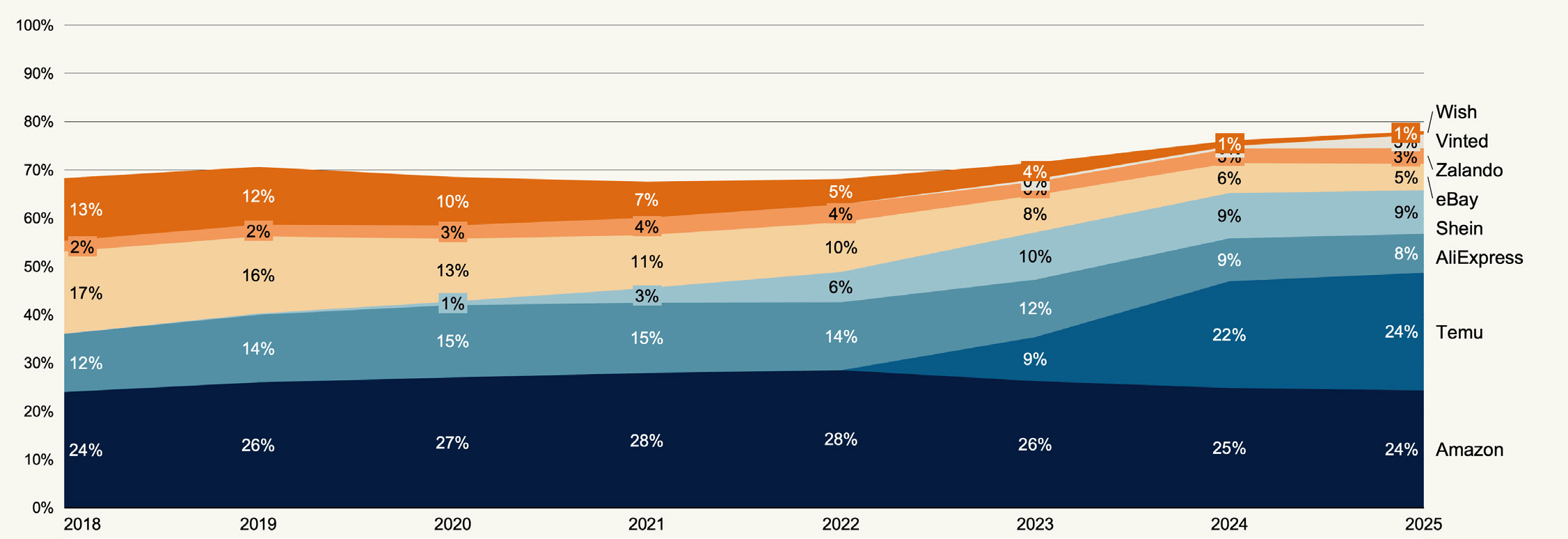 从其他平台表现来看,跨境交易量排名第三的Shein市场份额稳定在9%,与Temu相比增长乏力;速卖通份额从2024年的9%下滑至8%;eBay约占5%;而Zalando则以3%的市场份额,成为2025年跨境交易量最大的欧洲平台。拉长时间维度观察,行业格局变化更为明显:2018年至2025年间,Wish的跨境交易份额缩水高达95%,eBay下滑68%,速卖通减少了33%,传统平台在新一轮竞争中压力持续加大。