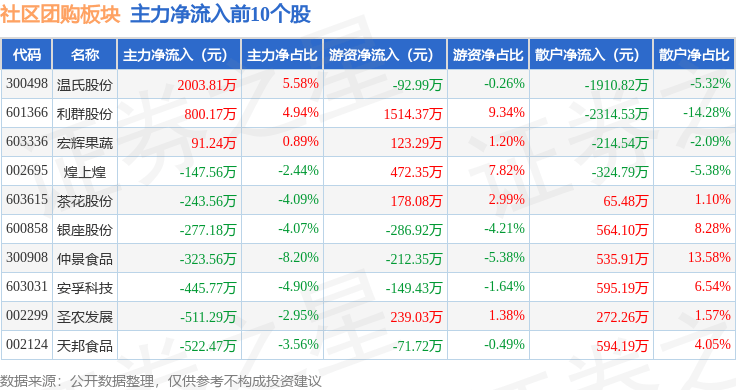 从资金流向上来看,当日社区团购板块主力资金净流出11.28亿元,游资资金净流入1.67亿元,散户资金净流入9.61亿元。社区团购板块个股资金流向见下表: