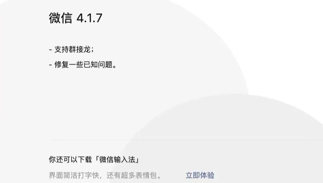 Mac 微信 4.1.7 的更新日志简洁明了,加入了「群接龙」功能。